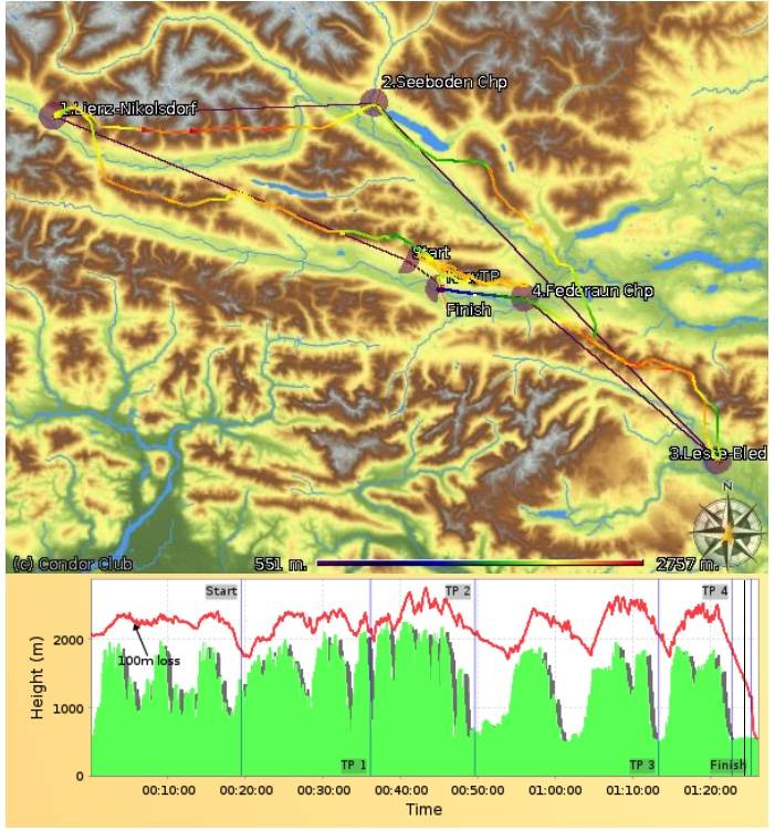 スタート直後からリッジに入り、TP2付近はブルーな状況でサーマルが有るかもしれないがどこにあるか分からない状況。TP3付近は気象条件がさらに良くなる見込みのタスクコースとなっていました。今回は上位3名は平均速度が170km/h以上になるハイスピードタスク。どのリッジを使うのか、リッジ間の遷移をどうするのかでそれぞれの選手の選択が別れたレースとなりました。そこでSoaring Labを使って全選手の飛行経路を表示してみました。各選手がどのような経路を辿ってタスク攻略をしたのか、各選手はどんな作戦を考えていたのか色々と考察してみるのも楽しいですね。