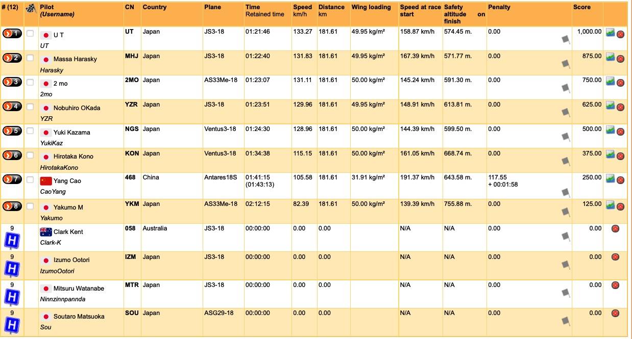 実はReporting PointであるTP5の少し手前が小高い丘になっていて皆さんギリギリの高度で通過、TP4からTP5まではエナジーラインを考えながらスピードと高度の管理に落ち着く暇はなかったのではないかと思います。そして最終結果はUTさんがトップフィニッシュ、続いてMHJさん、2MOさん、YZRさん、NGSさんと続きます。今回は上位陣にはペナルティはなくゴール順通りの順位となりました。