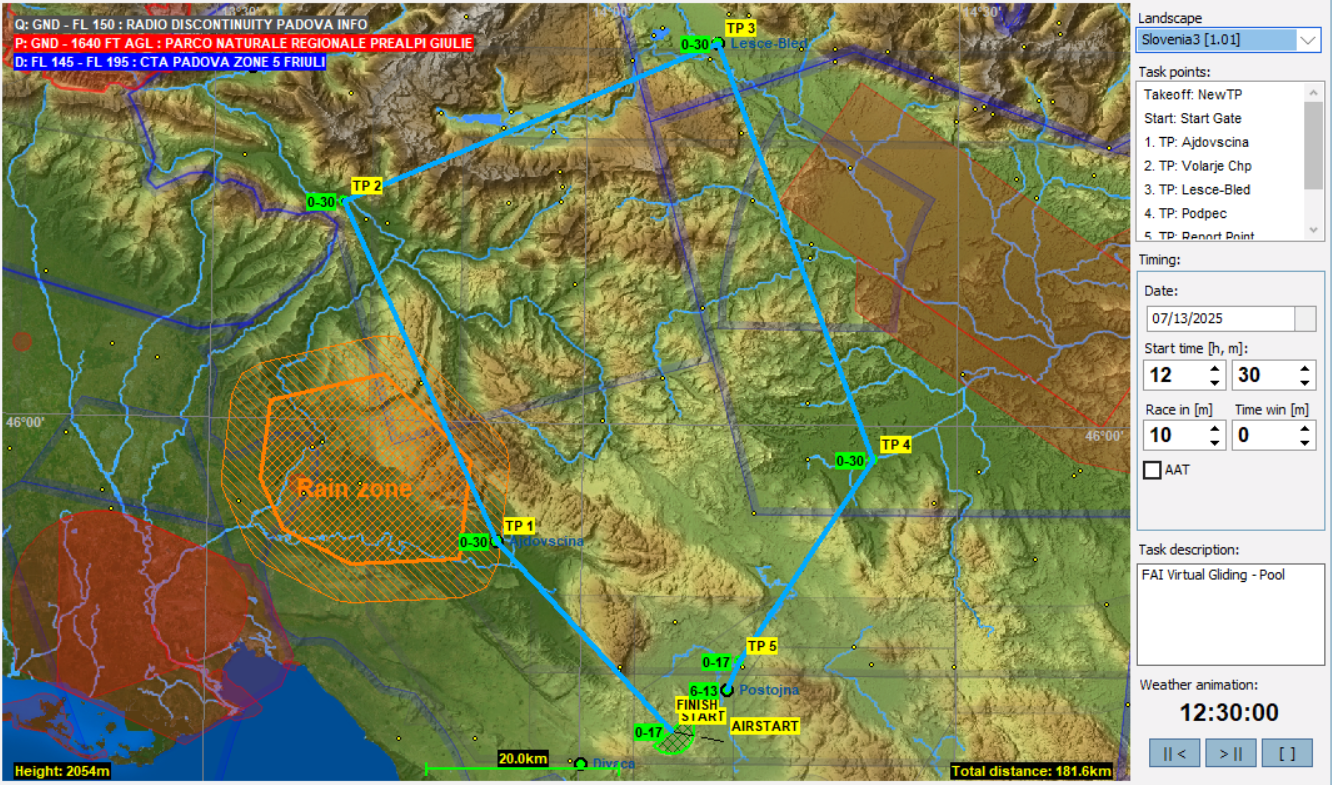 TP1からTP2に向かう途中には北東方向に移動するRain Zoneがあってタスクライン上には雨が降っていました。そこで、ほとんどの選手は台地のヘリを辿りながら雨の降っているところを避けて飛んで行きますが、MHJさんは雨の隙間を縫って直線距離を辿ります。