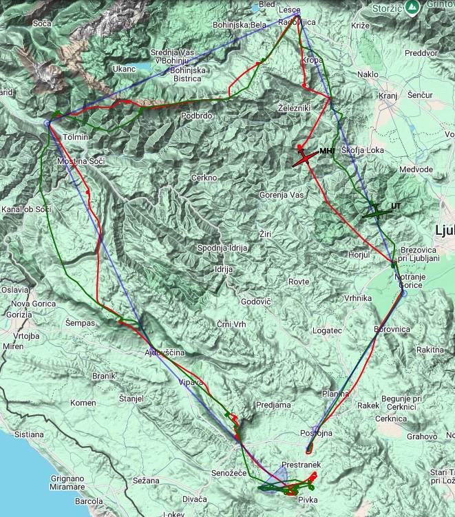 ただ、それぞれに要所要所で高度を稼ぎながら進んでいくと、そろそろファイナルグライドというところ、TP4のすぐ手前のサーマルにUTさん、MHJさんを始め先頭を追いかけてきた5名が一同に集まって同じサーマルで旋回を始めます。それぞれの判断で残り30kmほどのファイナルグライドに入ったのですが、ここで真っ先にUTさんがスタート、追付いてきたMHJさんはもう少し高度をとって遅れてスタート、そして後続グループがスタートです。