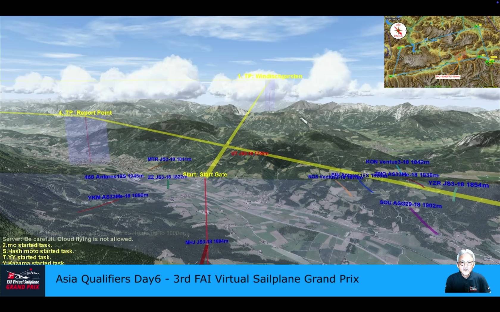 スタートはいつものようにUTさんがいち早く飛び出して行きます。二手に分かれてタスクライン上の山の上にできた積雲を目指して飛んで行きます。第1レグは風上に幾つかの山を越えて行かないと行けないので、うまく速度/高度管理をしながら前に進んで行かないといけません。早速ここで積雲の掴みに苦労したパイロットが出てきたので一斉にスタートした隊列が大きく広がってしまいました。