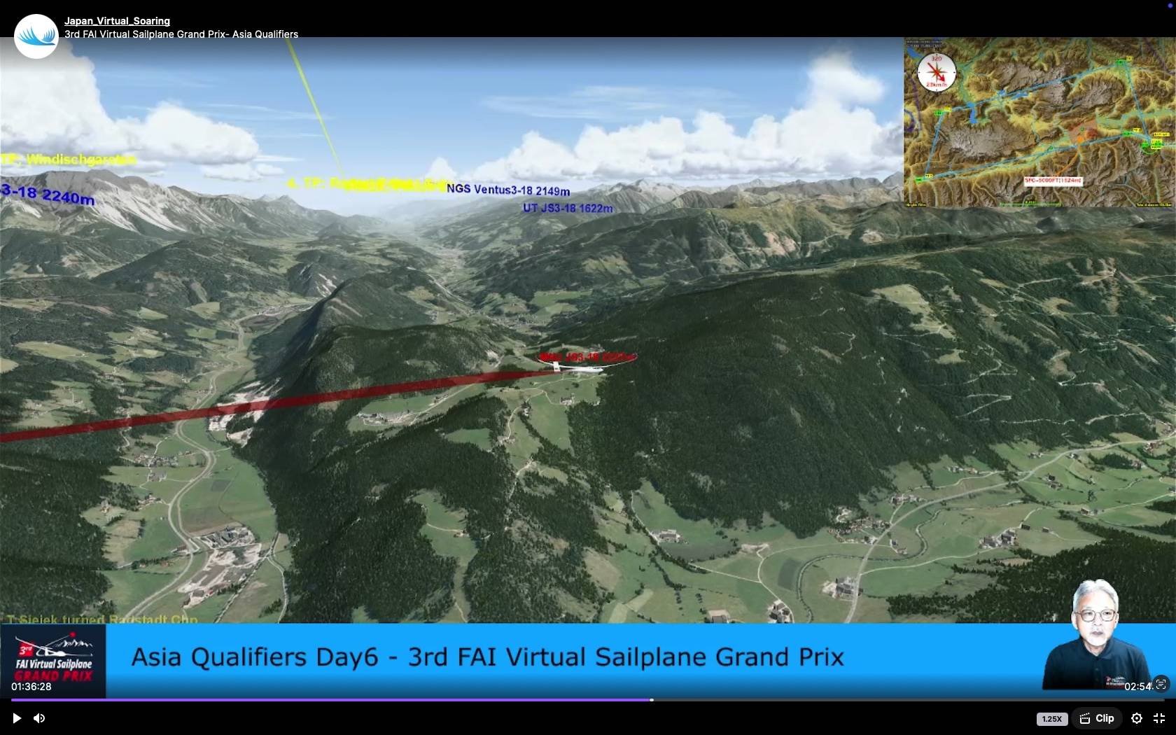 しかし、この狙いはうまく当たらずMHJさんは順位が後退、TP3周回後はUTさん、NGSさんが長いリッジでのトップ争いです。UTさんは山に張り付いて斜面風を利用しながらどんどん前に進みます。一方、NGSさんは山とは少し離れた谷間の上空で少しウェーブ気味のところを見つけたようで高い高度を保ったまま進んで行きます。