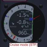 (イ) E-Vario:スティックサーマルなど運動エネルギーと位置エネルギーの関係を補正したバリオ(Total Energy Compensated Vario)。Climb/Cruise切換でクルーズ時にはSpeed to Fly表示ができる。