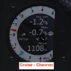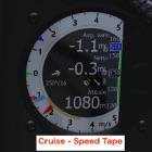 ・赤の指針と右側のシェブロン模様がMC値で設定したクルーズ速度より早いか遅いかを示す。速度がMC速度より速い場合は+側に、遅い場合はー側に振れる。