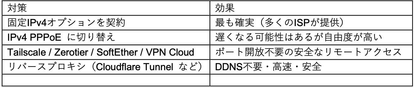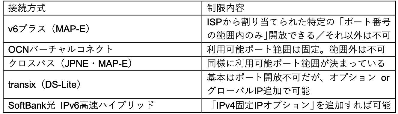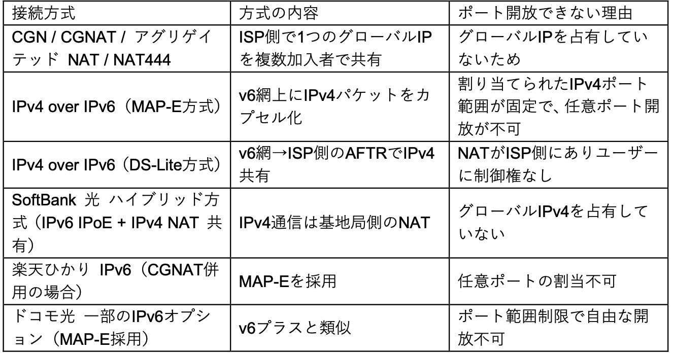 インターネット接続方式には、IPv4の枯渇対策として採用されている方式の中に、「外部からLAN内サーバーへアクセス(ポート開放 / ポートフォワード)ができない、または特別な条件が必要」なものが存在します。