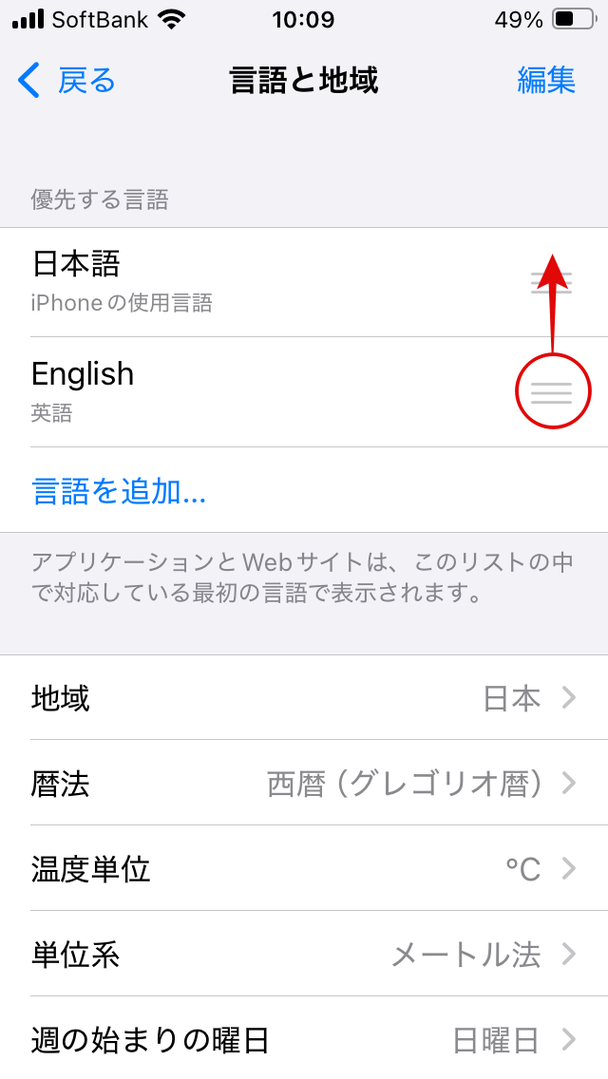 ②英語の右にある三本線をドラッグして一番上に持ってくる(英語がない場合は「言語を追加」で追加する)