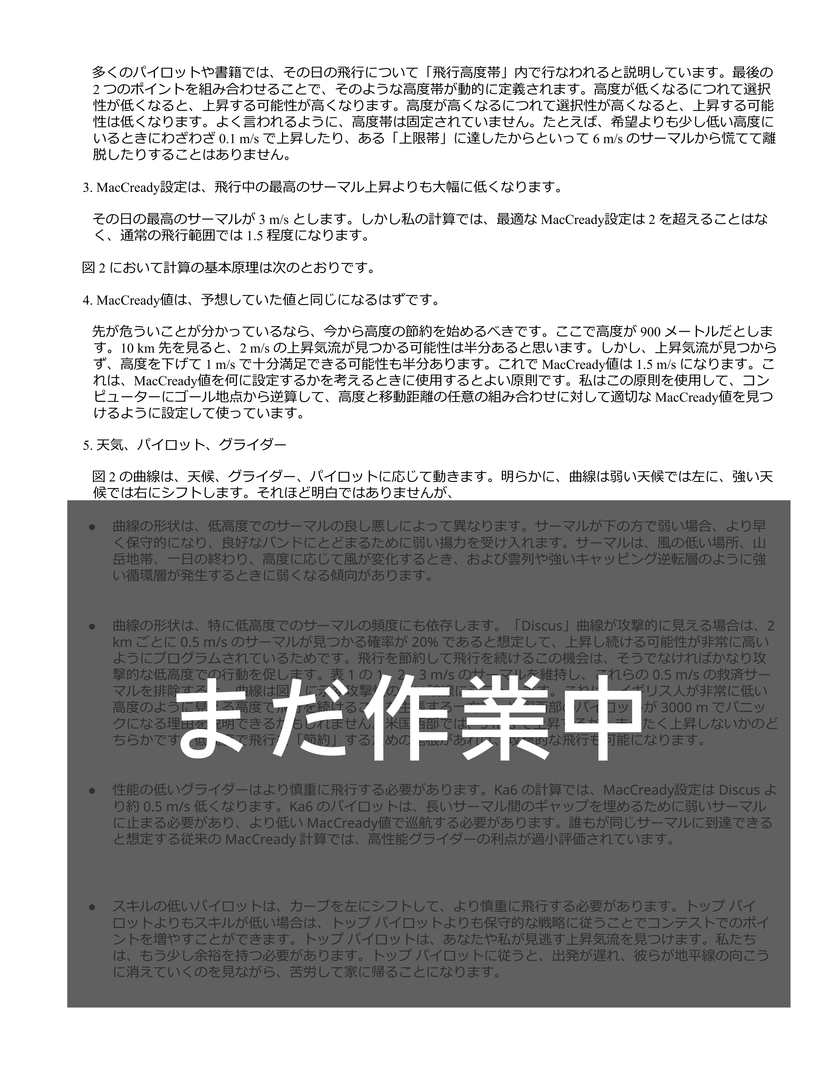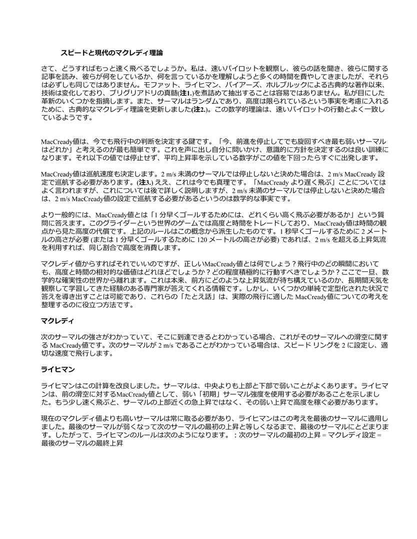 題名が「Just a little faster, please」とあり、脱初心者もしくは中級者向けの、サーマルとMacCready値設定の考え方についての文章になります。元文章は恐らく機関誌か雑誌に掲載されたもので、それを再編集抜き出したもののようです。またかなりリアルフライトに寄った内容となっていますが、バーチャル世界であるCondorでのフライトにも十分生かせると思われます。