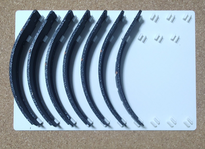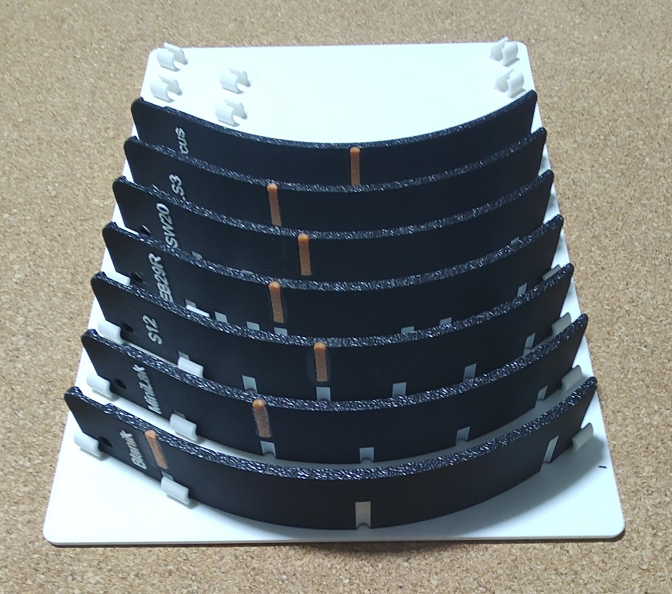 そこで、素早くフラップ定規を取替えられるように、適当なデータをでっち上げて各機体のフラップ定規を板の上に並べて置けるプレートを作りました。