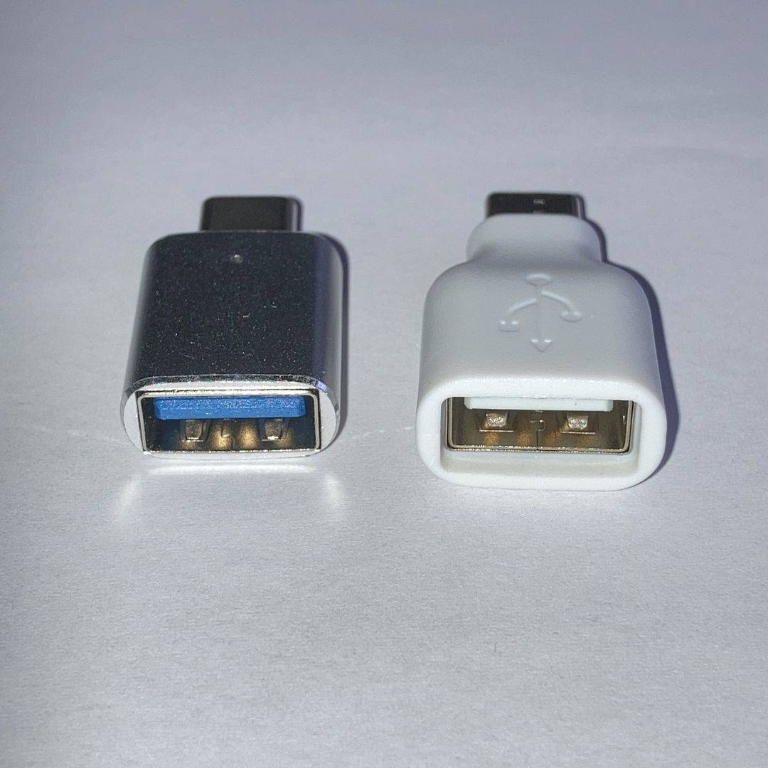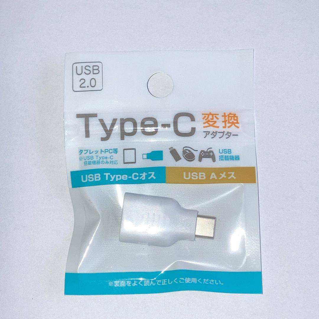 【対応策】Type-C端子しか持たないPCへの接続は①付属のケーブルをUSBハブに接続してType-Cに変換する、または②付属ケーブルにType-A→Type-CアダプタをつけてPCのType-C端子に接続する。なお、機器によってはUSB3.0用アダプタだと認識できない場合が有るが、USB2.0用のアダプタならいずれも対応可能。USB2.0対応品は見つけるのが難しいが2025.9現在Seriaで販売中、多分一番安価だと思う。