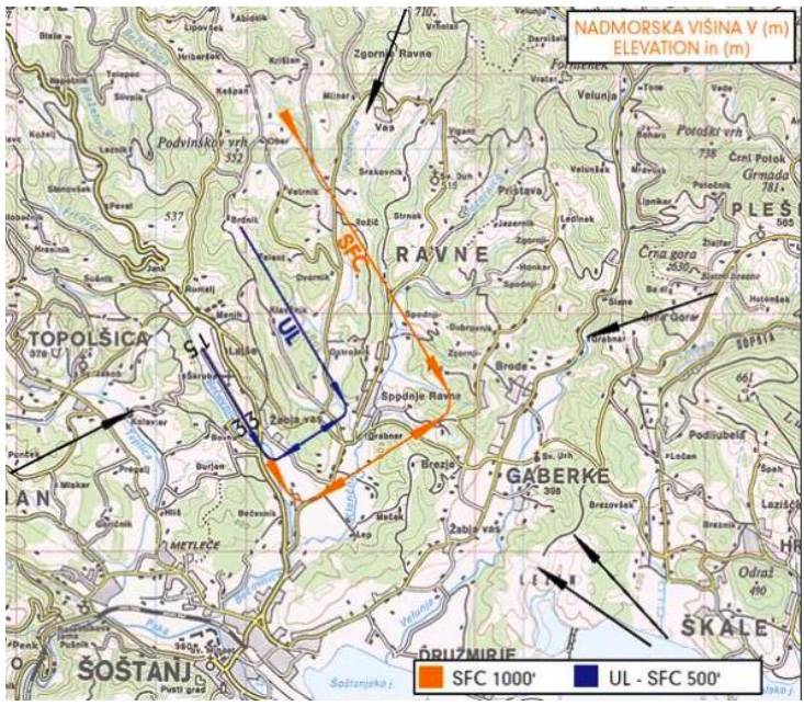 地形の変化に富んだ地形のため、晴れた日には強い上昇気流が発生し、午前9時から午後6時まで続きます。上昇気流の連絡路はQFE250mの高さにあります。上昇気流のある日には、谷間を南方向に0.5~1.5m/sの風速で吹き抜けます。南風の日は、風向は330°です。南西風の場合、地上の風は高度100mまで南方向に曲がります。そのため、滑走路進入端(方向33)から700mの距離では、高度150m以上では中程度の乱気流が発生し、高度150m以下ではローターが回転する強い乱気流が発生します。したがって、このような状況では航空機の着陸は推奨されません。南風の場合、風は150°の方向から地上に吹き付けます。これは最も一般的な風向で、風速は2~5m/sです。霧が発生することは非常にまれですが、発生する場合は通常、より広い範囲に広がります。年間を通して、最も一般的な雲量はCuで、雲底は700~2500QFEです。前線や局地的な嵐は、ほとんどの場合、北西から発生します。局地的な嵐は、春に多く発生します。冬季の積雪の厚さは通常20~30cmです。