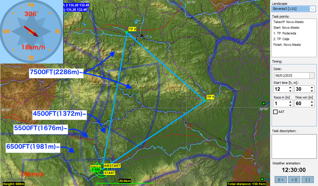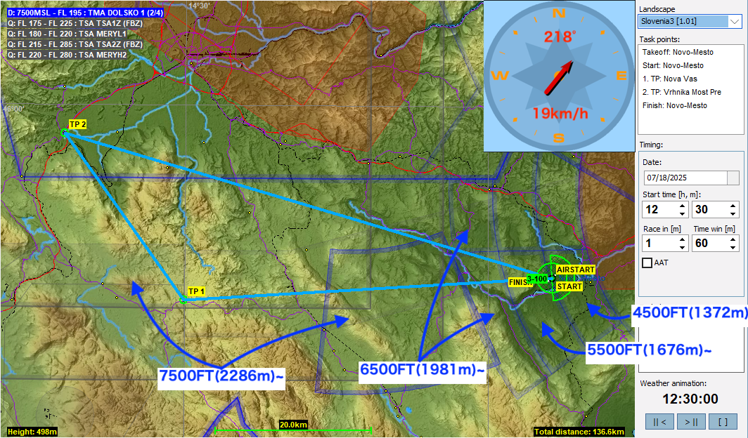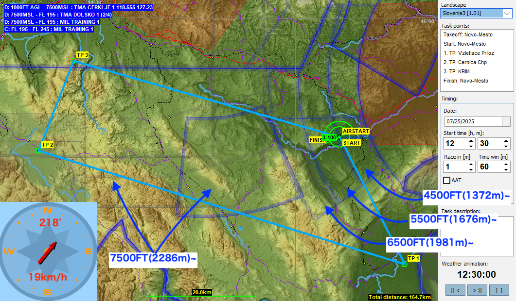 さて、今月のタスク、まず注意していただきたいのがR/W近くの空域です。R/W上空はCerklje(ツェルクニェ)空港のTMA空域に入っていて4500FT(1371m)以上に上がってはいけません。そこで、これまでJPFFはAGL1200mとしていたところを空域にかからないようにAGL1150m(MSL1320m)とします。スタート前に高度を稼いだりキープするのはR/W西側の5500FT(1676m)のエリアで飛んでください。