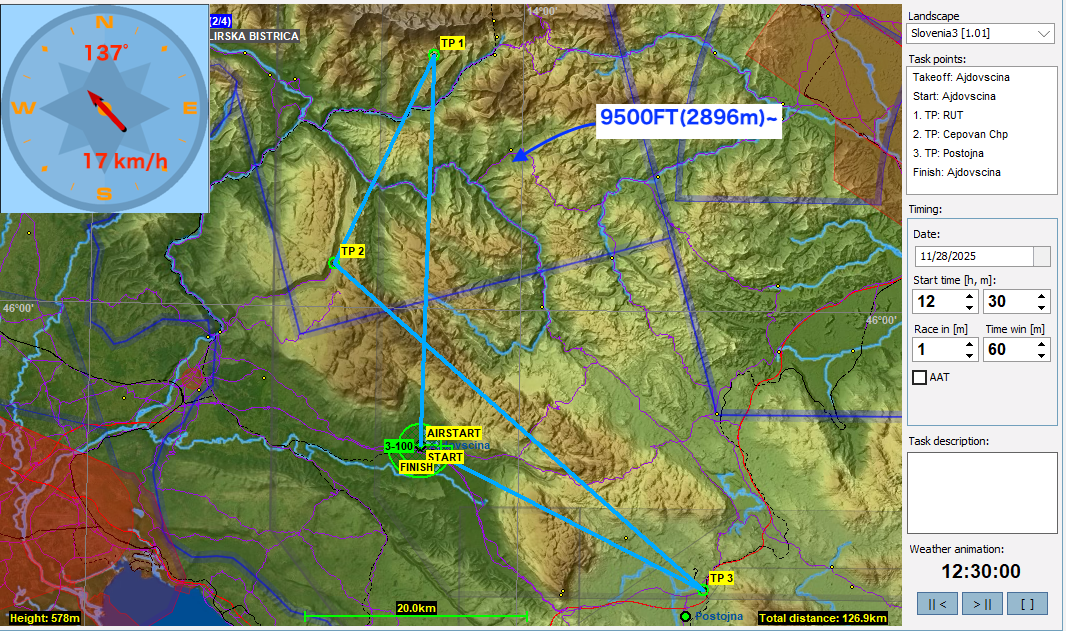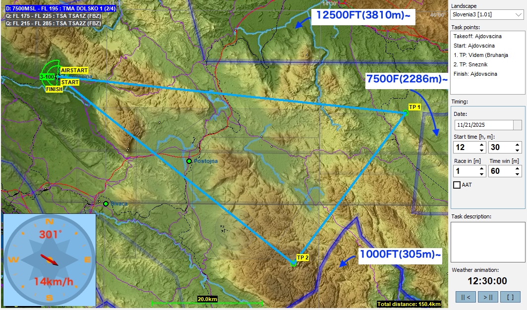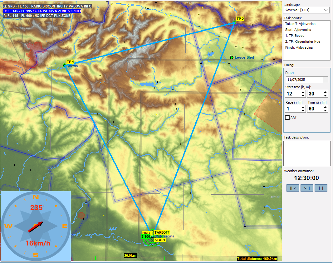 第二週はスロベニアから西に向かい国境を越えてイタリアに入っていきます。TP1,TP3のあたりの空域は今回は解除してありますが、RonchiのCTRとGorizia市内の地上からの空域に注意してください。特にRonch CTRはTP3に向かうタスクラインがかすめているので要注意です。