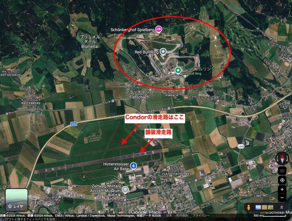 2月はオーストリア中部のZeltweg飛行場を使います。ここは軍民共用の飛行場でCondorの離発着用には舗装滑走路の北側に未舗装のRunwayが作られています。JPFFでは空中スタートを使うこと、ゴールは半径2kmのシリンダーなのであまり気にすることはなく、タスク終了後の着陸は舗装滑走路でも未舗装の滑走路でもどちらでも構いません。安全に着陸してもらえば結構です。