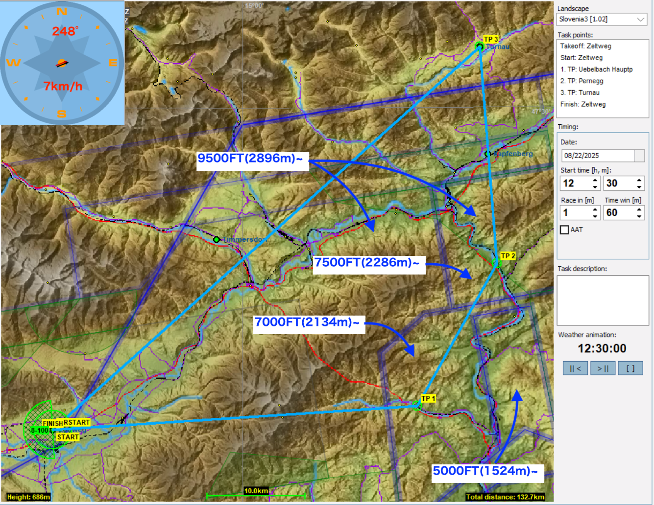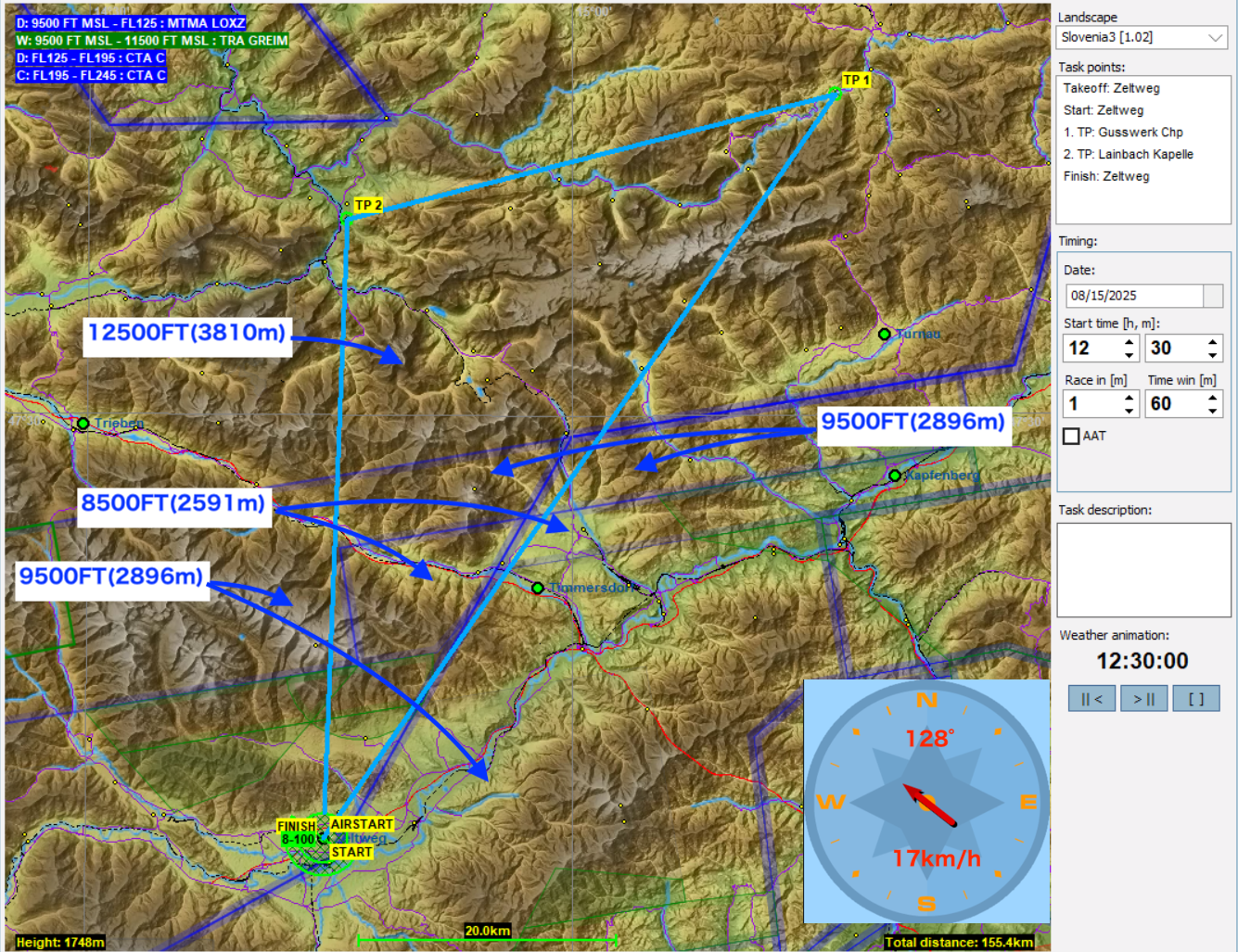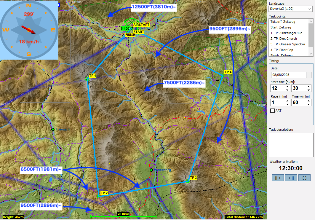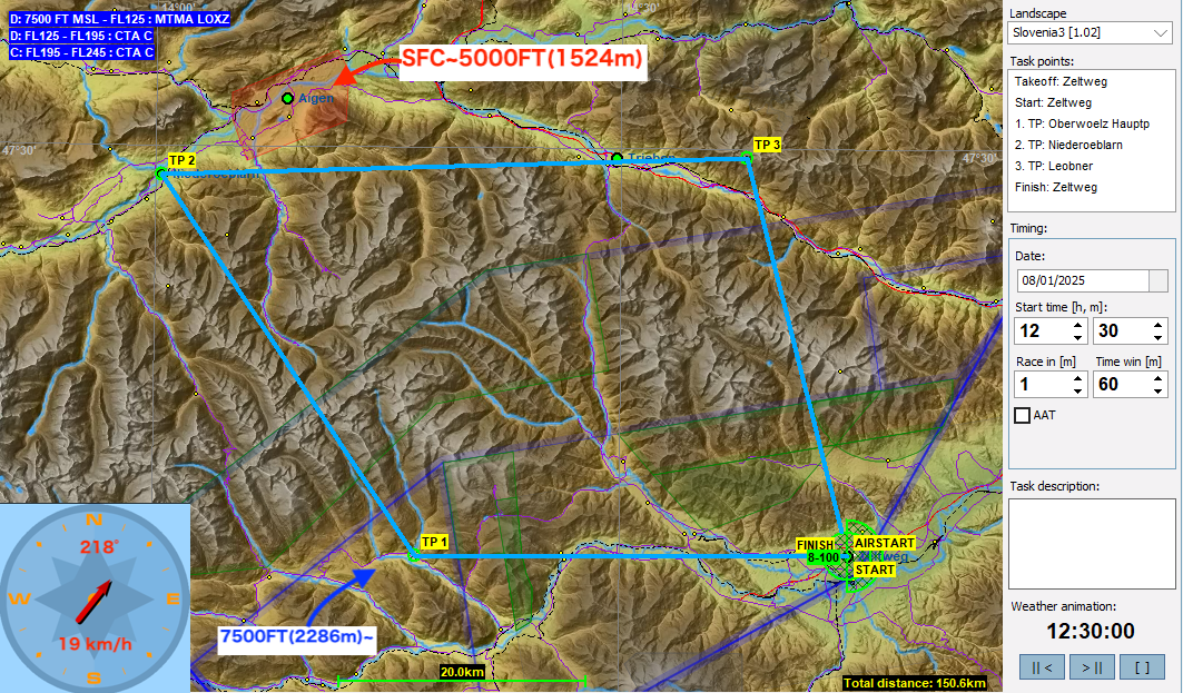 2月最初のタスクはFAI vSPGの第3戦で使われたタスクに前半そっくりに作ってみました。TP1に向けて真っすぐ飛べないのでどこまで回り道をするのか。また、TP1は7500FT(2286m)と雲底よりも低い高度に空域が設定されています。第二レグで山に入って行くので手前でしっかり高度をとってからTP1をクリアーしたいところですが、うっかりとこの空域に入ってしまわないよう注意してください。また、TP2の直後にもAigenの軍用飛行空域が地上から5000FT(1524m)まであるので要注意です。