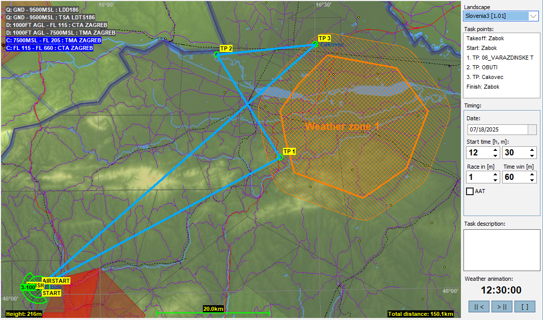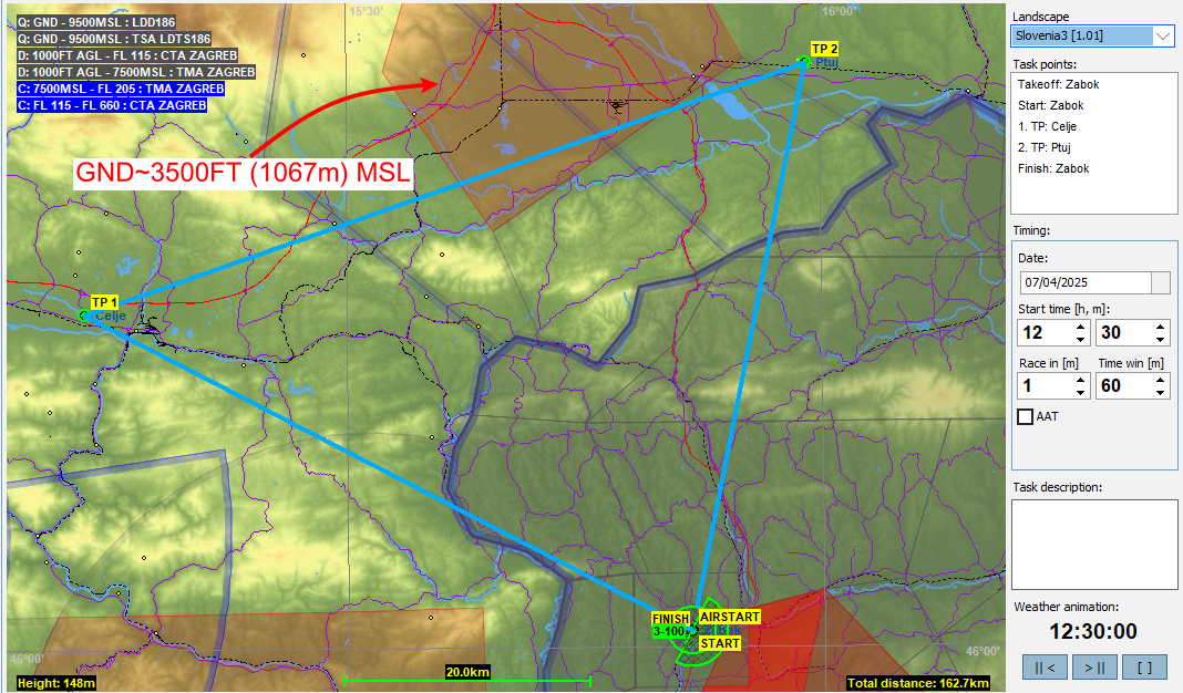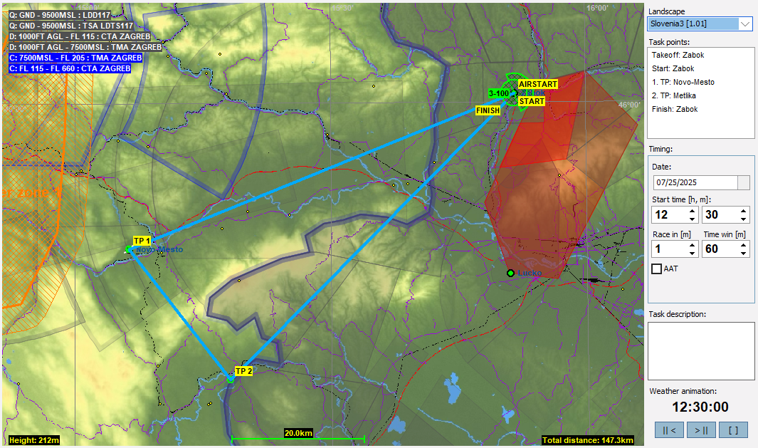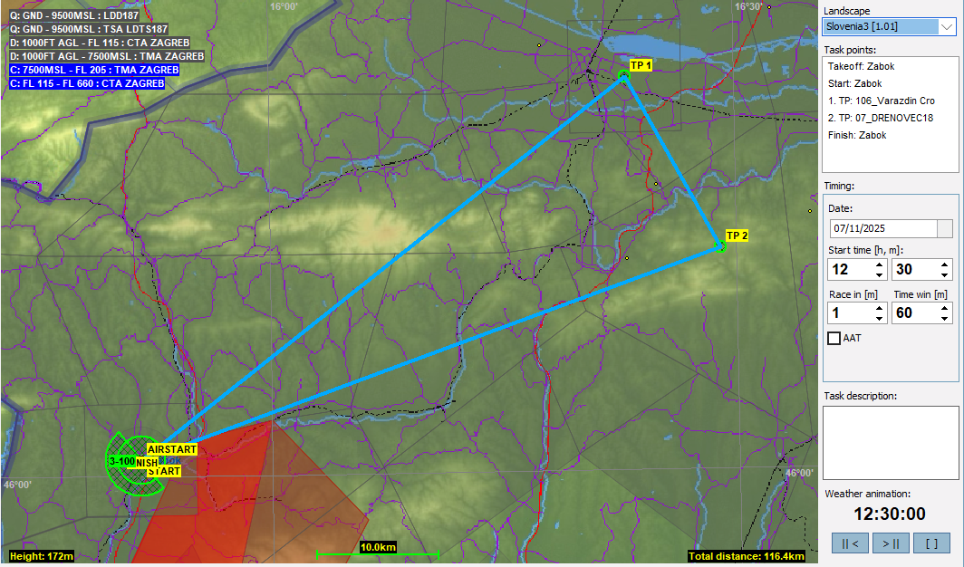 7月はクロアチアのザボク(Zabok)をスタート地点とします。実はCondorのデフォルトではクロアチア全域に空域が設定されているのですが、今月のタスクのためにほとんどを解除してあります。地上から始まるCTRは一応残してありますが、ザボクの横にあるCTRは同時にW zoneも設定されているのでここは実質的にはフライト制限ないのでご安心ください。なお、タスクによってはCTRも解除しているのもあるのでタスク紹介のところで説明します。