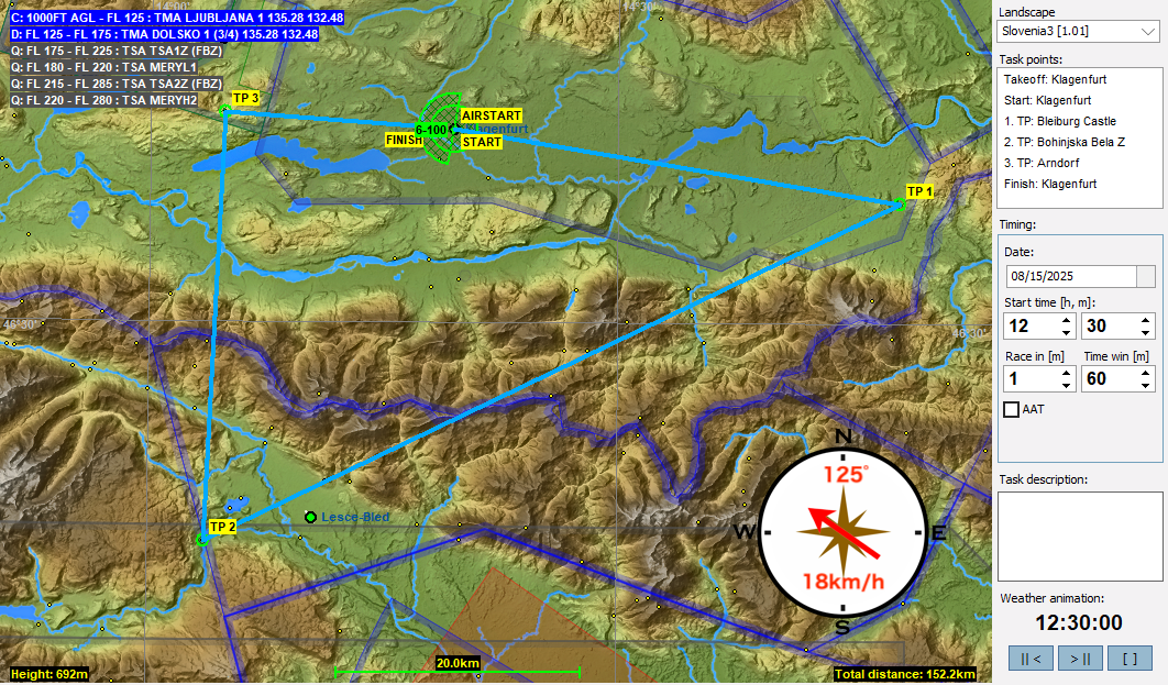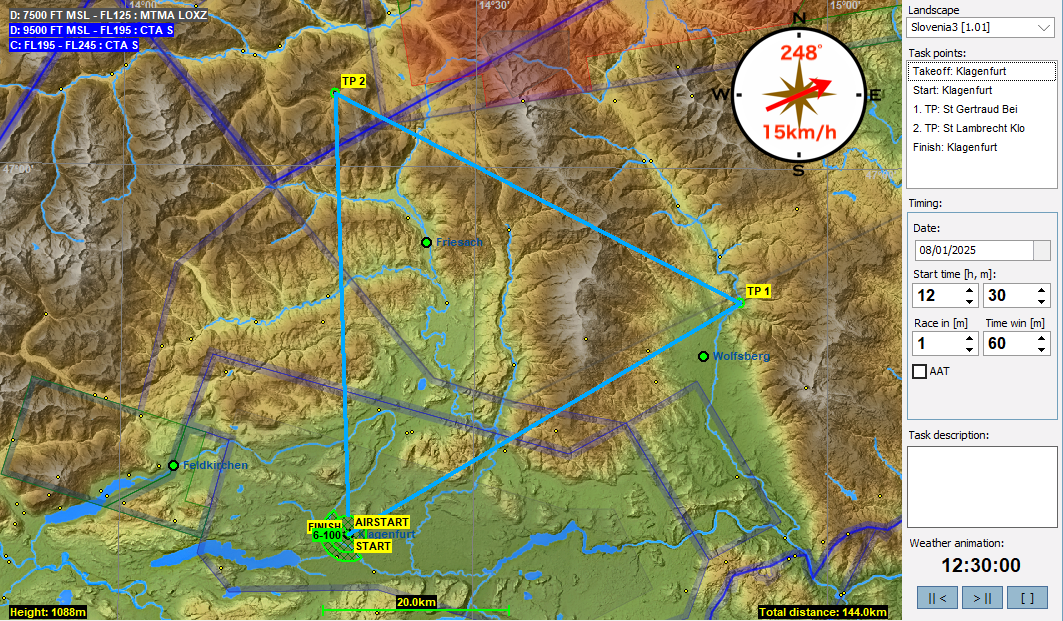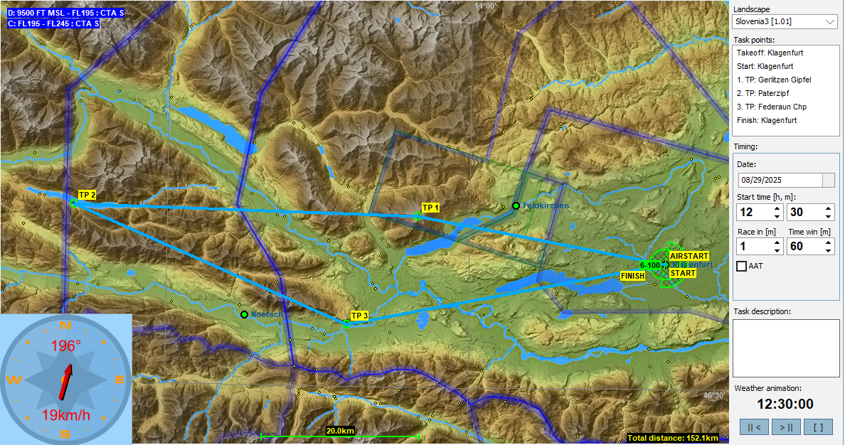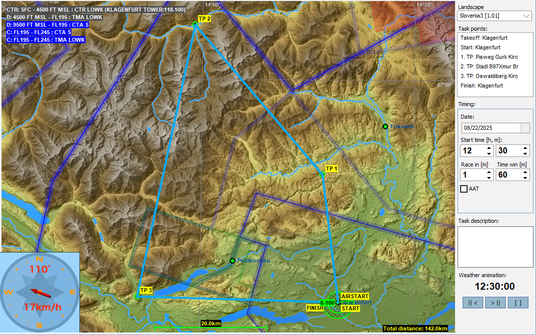 8月はオーストリアのKlagenfurtをスタート/ゴールとしたタスクを回します。南に下るタスクでは国境を越えてスロベニアに入って戻ってきます。Klagenfurtは大きな空港なのでCTRやTMAなど複雑な空域が有るのですが、今回のタスクでは6500FT(1981m)未満の空域は解除してあります。そのためフライトにはほぼ支障はないと思いますが、必要なところは解説で個別に記しましたので注意ください。