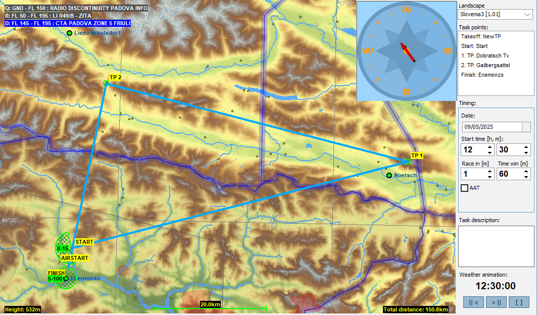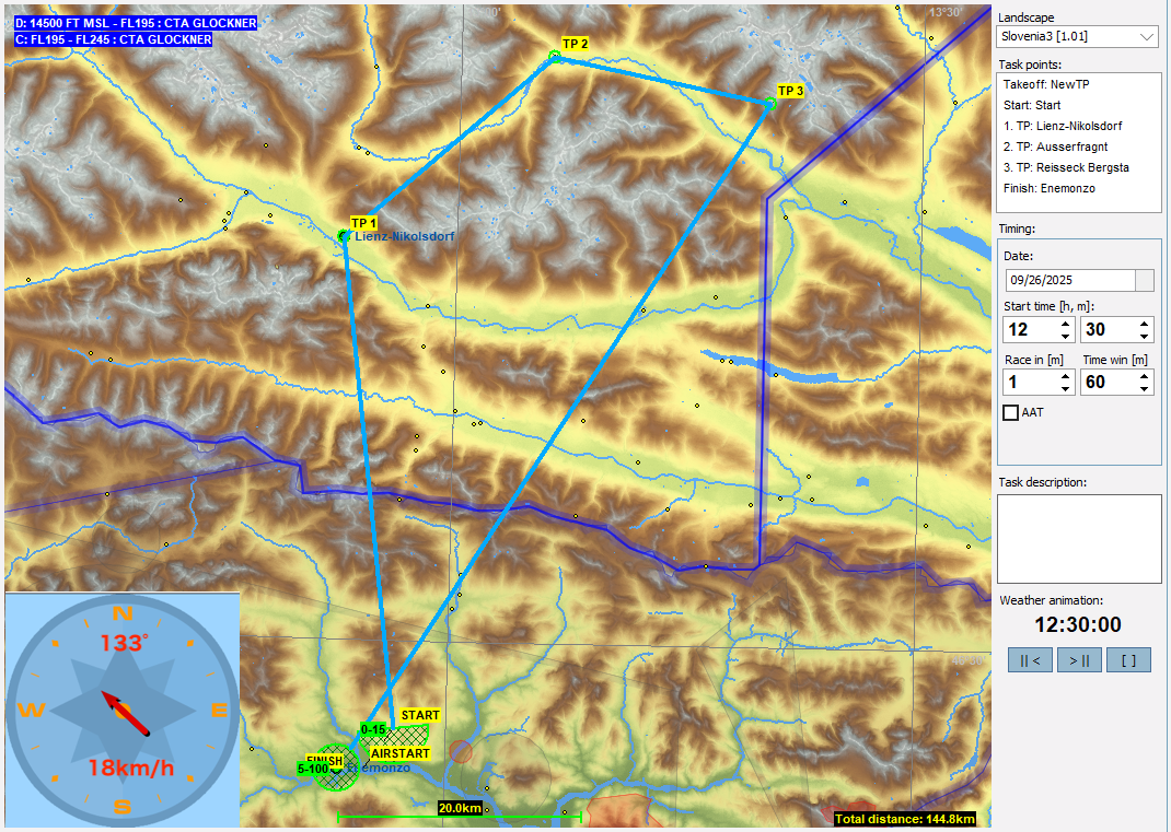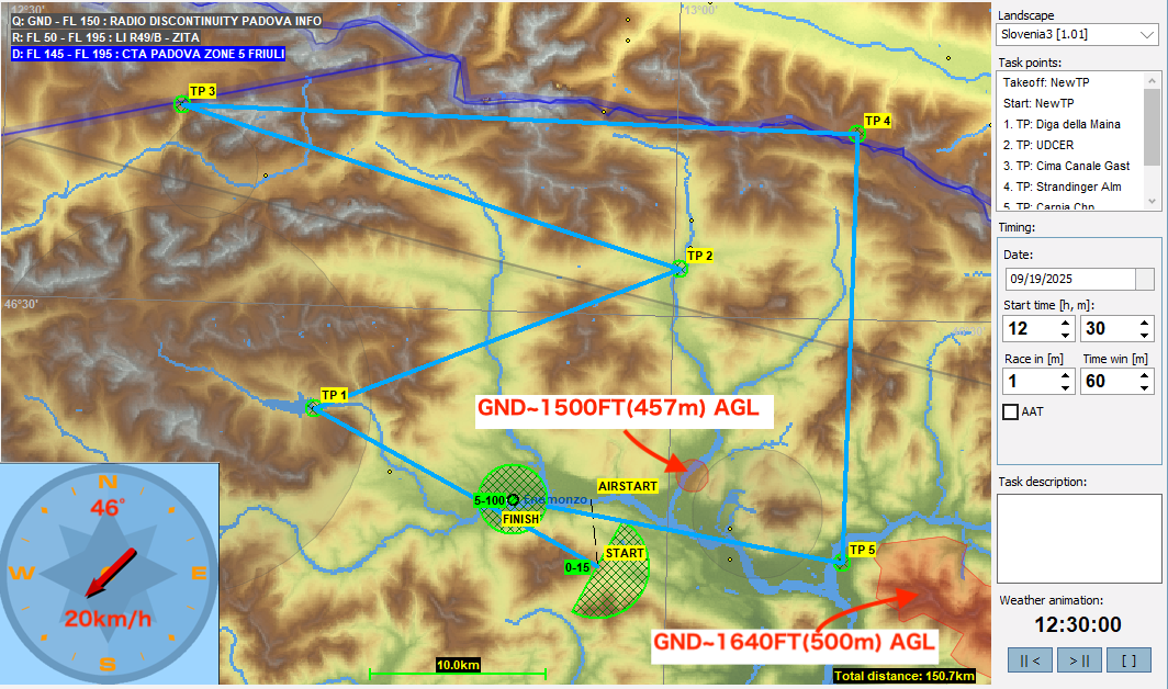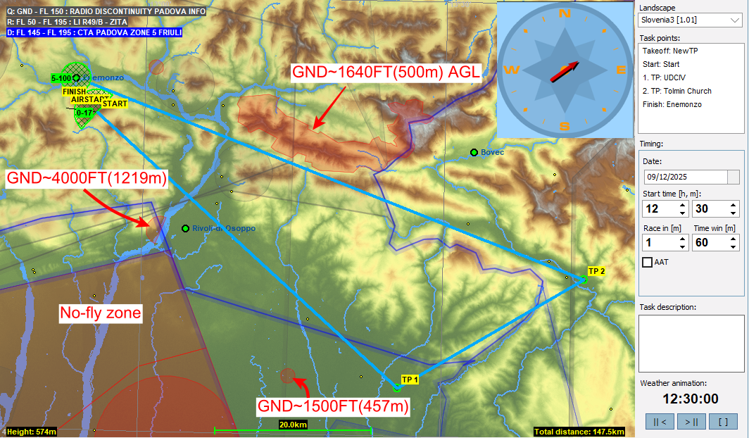 今回は東に向かい一旦スロベニアに入った後にイタリアに戻ってきます。前回と同様、スタート直後は山の上に出来た積雲をうまく掴まないといけないのでちょっと難しく感じるかもしれませんが、それを抜けると前半はサーマルを使ったレグ、後半はリッジを使ったレグになります。なお、最終レグには公園保護区域の空域が有り、制限高度はAGLで設定されているので注意下さい。
