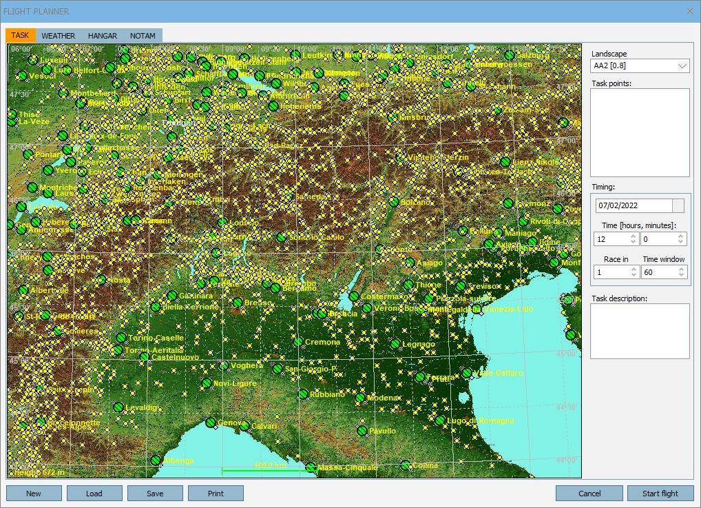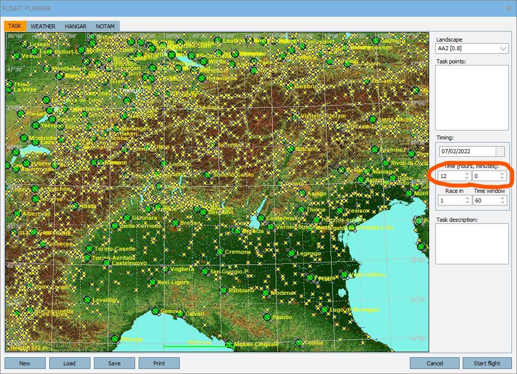 ・タスク距離: おおむね200Km。フライト時間1時間30分~最大2時間をめどとします。リッジタスクを作る場合は距離が少し長めでもよいです。渋いサーマルタスクの場合は少し短くしましょう。AATで作る場合は時間を1時間30分とします。CondorのTask画面ではシリンダーの半径は5Kmが最大値なので、Flightplanファイルをテキストエディターで開いて希望の半径に設定してください。こちらのページにAAT Plannerというソフトもあります。