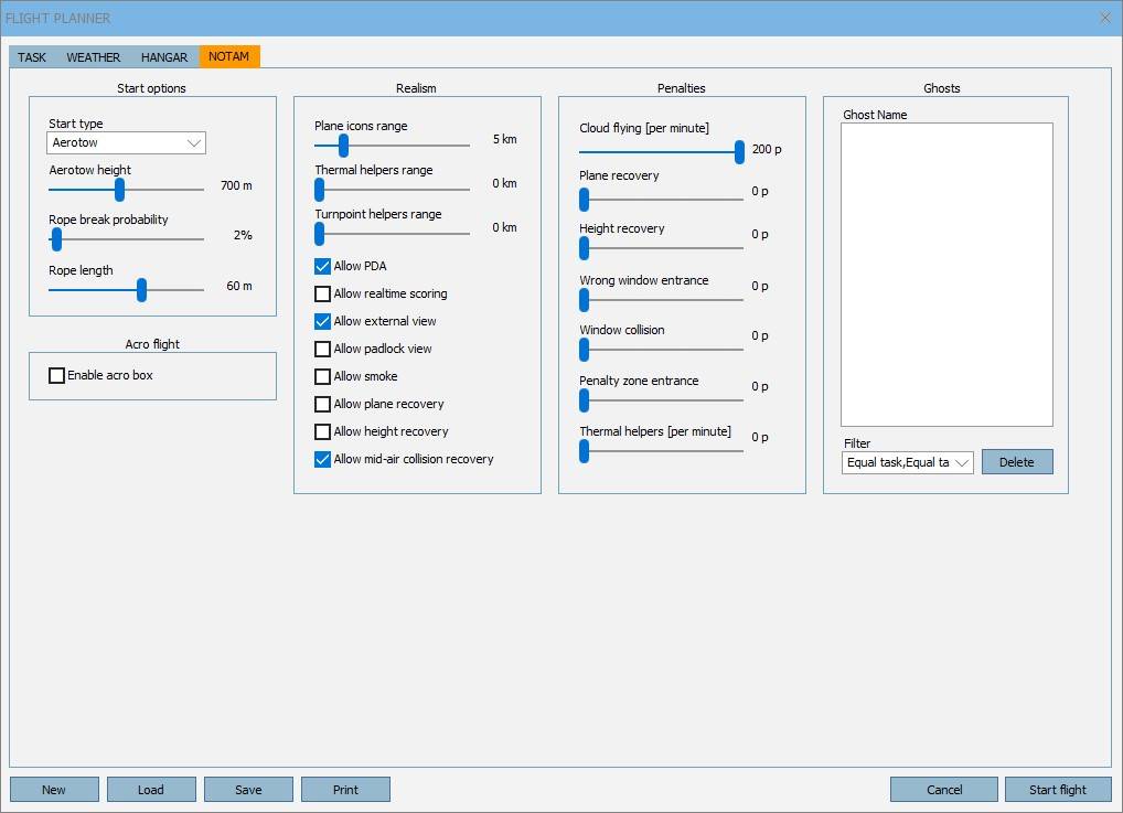 試し飛びをする場合はNOTAM画面でAllow height recoveryにチェックを入れてQキーで高度を稼ぎながらカッとんでいくとよいでしょう。なお、このときQキーはいったん曳航が始まらないと働いてくれません。曳航が始まって離陸速度に達したところでおもむろにリリースしてからQキーを押すとスムーズにフライトを開始できます。
