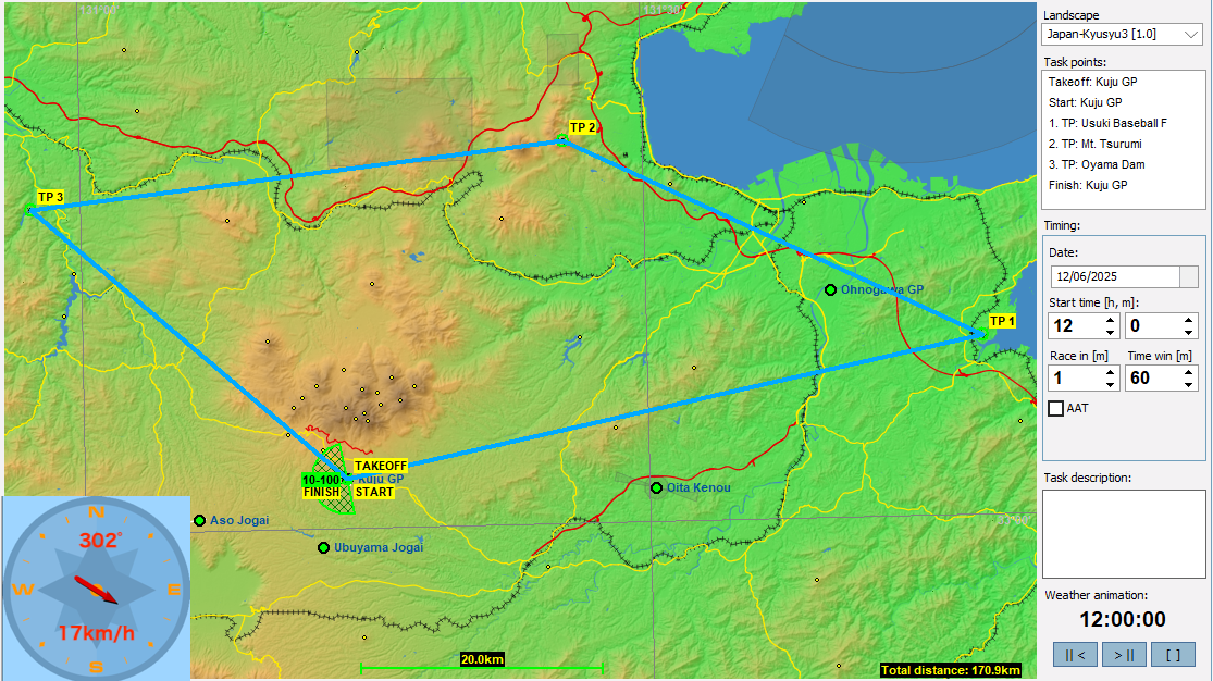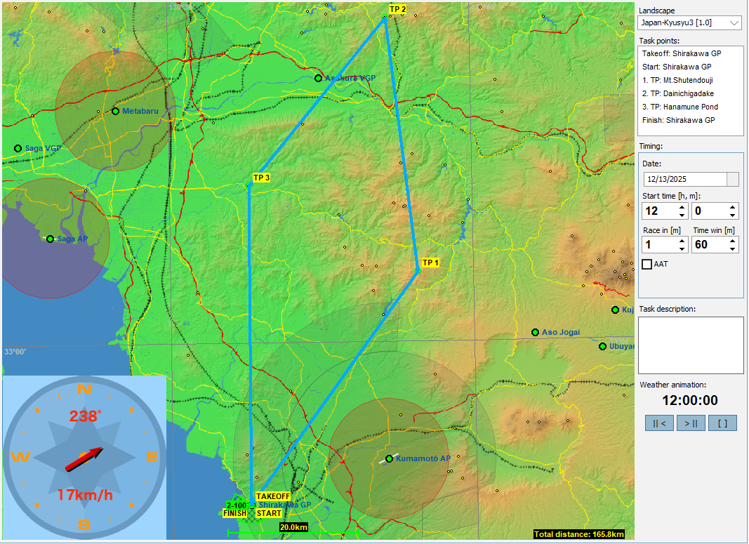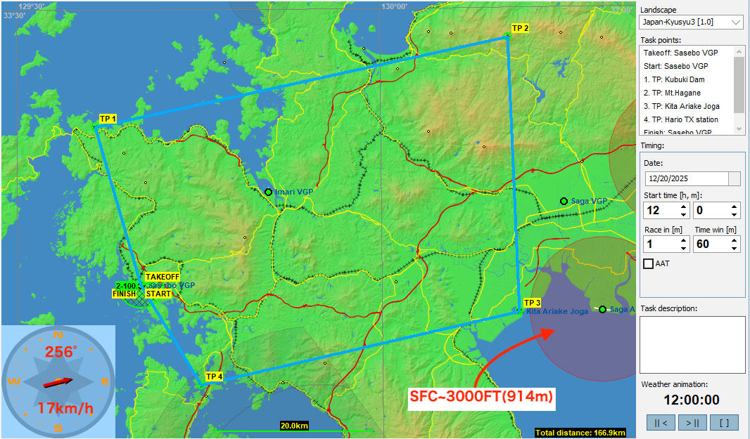 今年最後のJVSCタスクは朝倉VGPを出発してぐるりと回ってきます。タスクラインの横には順番に築城基地(6000FT)、福岡空港(3000FT)、目達原駐屯地(3000FT)のCTRがあるので注意してください。