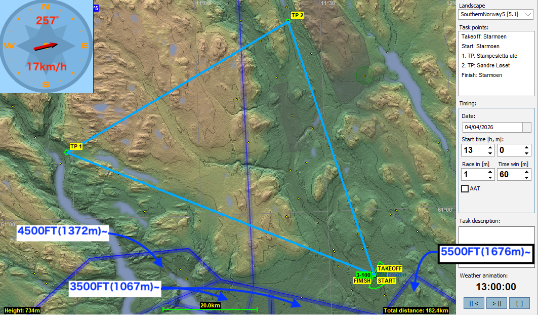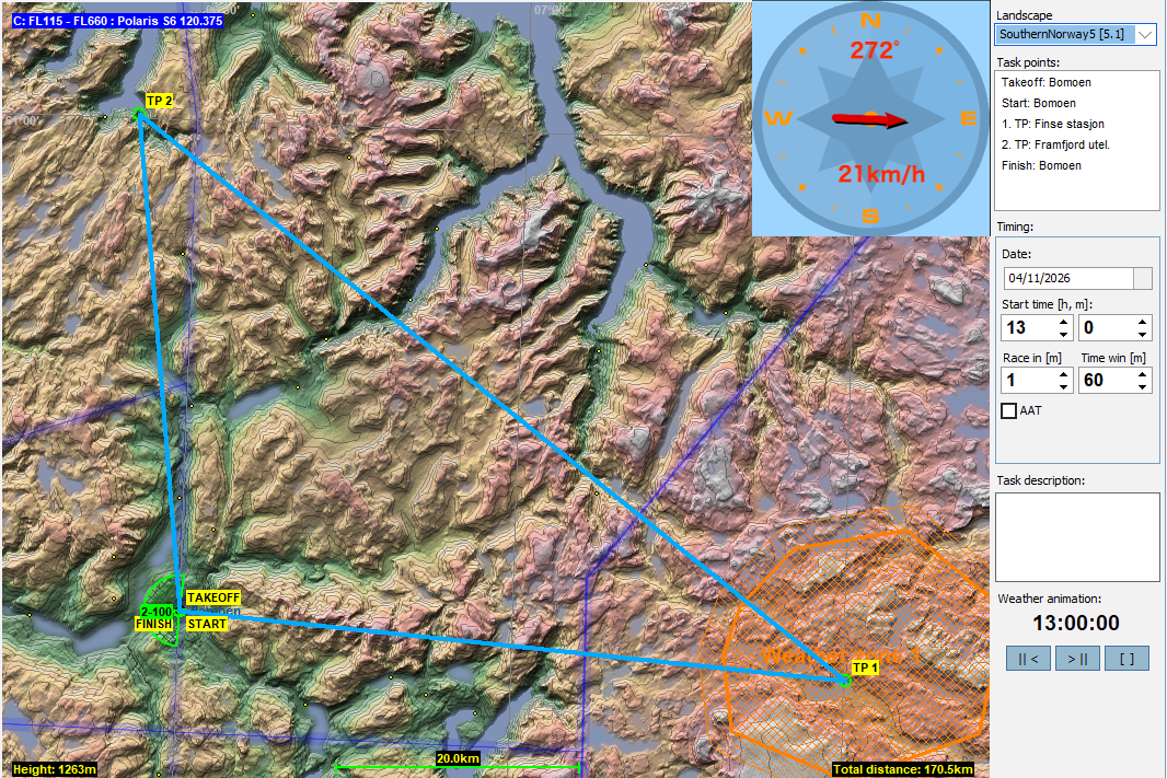 ノルウェーは深いフィヨルドの谷と広い台地が特徴の地形です。フィヨルドでは崖が切り立っているのでリッジが期待できつつも一旦谷に落ち込んでしまうとはい上がるのはかなりむつかしくなります。また、台地はかなり広く、その分雲底との地上高が低くなるので台地を飛び越えて行く時は慎重に速度を考えて行かなくてはいけません。フライト中も地図を良く確認しながらタスクを攻めてください。