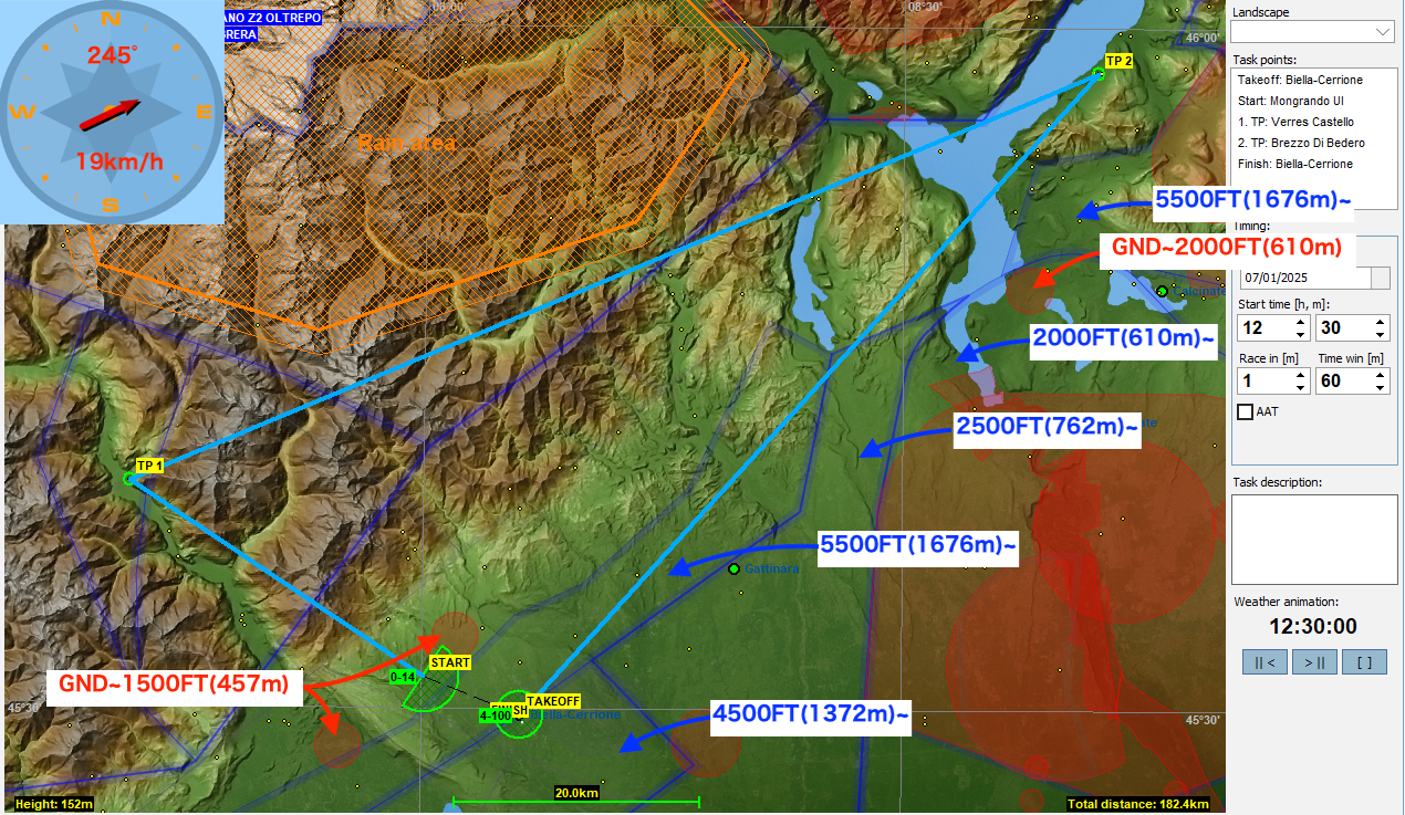 それでは、新年1月のチャレンジタスクの紹介です。今回はイタリア北部のチェッリオーネ空港をスタートして182.4kmを周回してくるタスク。平野から結構な標高の有る山に入って行くのですがスタート地点から山の入り口まで積雲が見当たりません。どうしましょう?そのため第1レグで斜面のどこかで十分なリッジが見つかることを期待しながら山に入って行く選択をした場合には高度に余裕が無いといきなり苦しくなります。その場合は効率重視のフライトで山の斜面に取りつきましょう。一方、山から離れたところには結構積雲が湧いているので遠回りして一旦高度を稼ぐのも一つの方法です。何れにせよ弱いリッジで斜面を上って行く時には無理をして斜面に激突することのないよう注意してください。