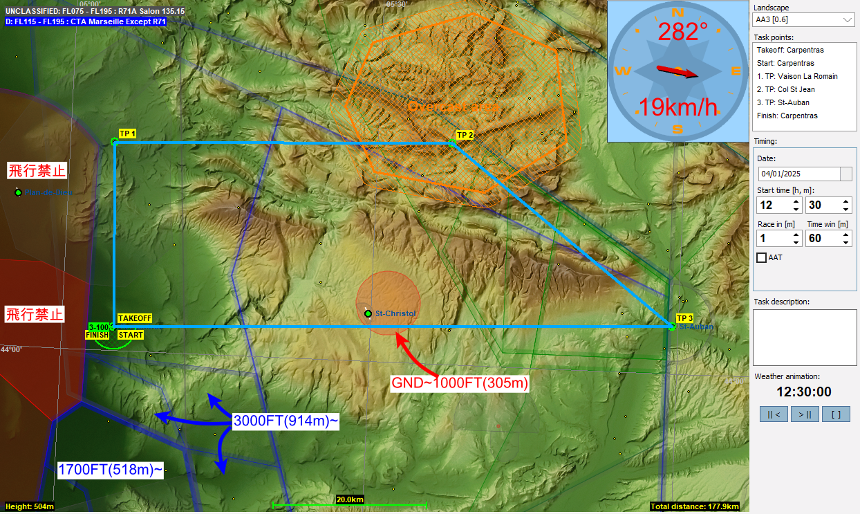 空域に関しては第1レグのすぐ西側に飛行禁止区域が有ります。風は西風なのでサーマリング中に気が付かないうちに空域に入ってしまうといったことはないと思いますが、飛行機曳航中になぜか曳航機がこの飛行禁止エリアに向かって行くことがあります。その場合にはすぐに離脱してAPに着陸するなり、一旦Exitしてもう一度曳航をやり直して下さい。空域違反のペナルティはスタート前でもアウトランディング扱いになります。