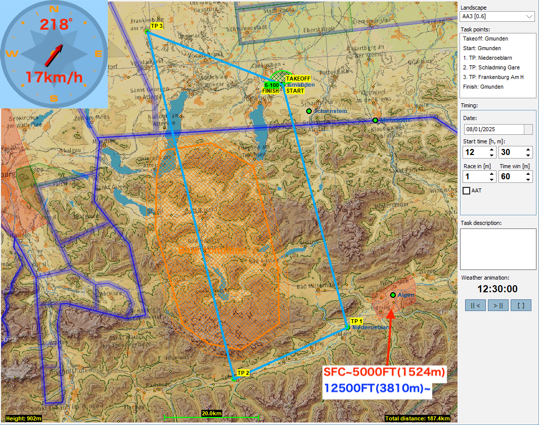 さて、2月はオーストリア北部のGmundenを出発して一路Niederoblarmまで南下、谷間を西進した後にまた北部に戻って行きます。第3レグに設定されたWeather ZoneはBaseとサーマル条件は同じですがブルーゾーン、サーマル上空には積雲が出来ていません。遠回りをすれば積雲の下を飛べますが皆さんどのような選択をされるでしょうか。ブルーゾーンを抜ける時は常にエスケープルートを考えつつ足を進めてください。まぁそうはいっても途中の小さなリッジ上にはサーマルが期待できるし、トリガーの上でしばらく粘っていればそのうちサーマルが育ってくることも期待できます。微妙な風を感じながらスピードにチャレンジしてください。