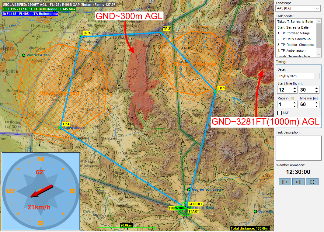 さて、9月のチャレンジはフランスSerres-la-Batieを起点とする183.6kmのタスク。結構テクニカルなタスクに仕上がったのかなと思います。曳航離脱後はうろうろしていると積雲に届かないので曳航中にどこに行くのか決めておいて下さい。さらにどのレグも単純にサーマル上昇値からMC値を決めることが出来ないのでクルーズ速度をどうするか多いに悩んで下さい。特にTP2は尾根の上にありますが雲底高度はそれほど高くないのですんなりと旋回点をクリアすることは出来ません、ところがTP2は絶壁の上にあるので500m半径内に入るには尾根の上を飛ぶ必要は有りません。そうは言いつつも壁に張り付いても斜面風がどこまで期待できるのか分からないところもあるのでTP2に向かう際には十分に高度をとった上で沈下率を見ながら最適と思う速度で飛んでTP2をクリアして下さい。なお、第四レグが最大の難関、TP4を低く周回するとその後高度をあげるのがかなり大変なことになります。うまく切り抜けて下さい。