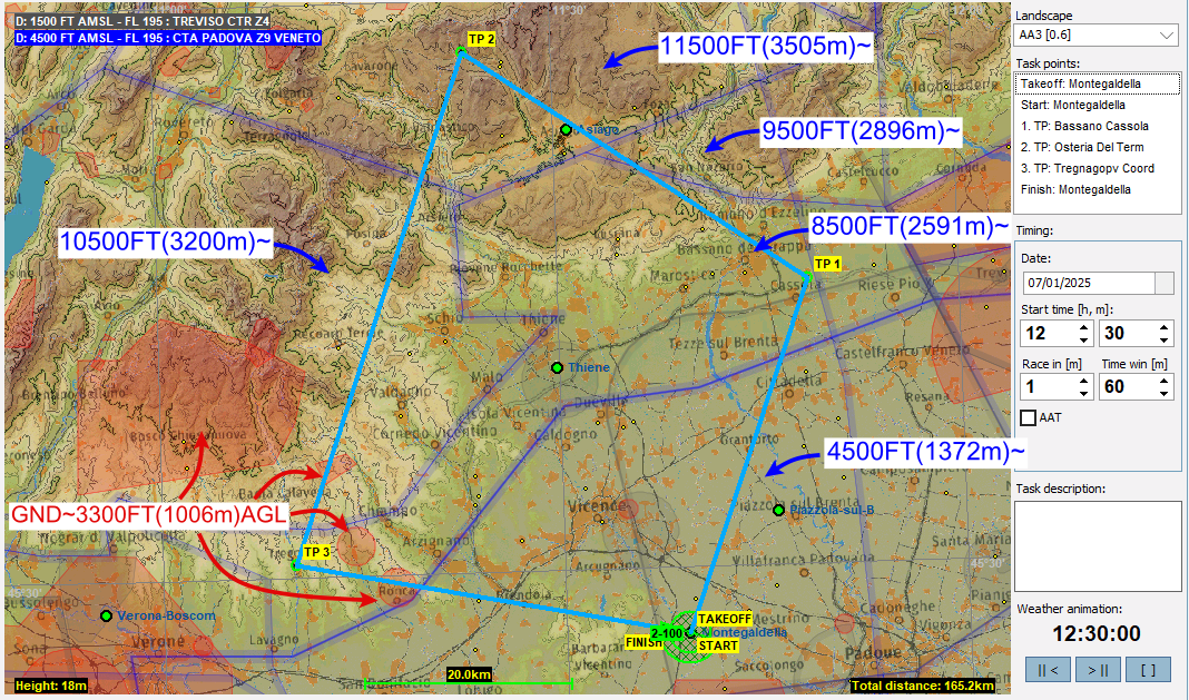 さて、7月はイタリア北部のMontegaldellaを起点とするタスク。R/Wはあまり整地されていなくてバンピーな地上滑走なので注意してください。今回のタスクは平地からスタートしますが中盤では山に入っていきます。雲底が低いので山に入っていくとAGLが気になるところ。また、不時着場が少ないので無理して山肌に引っ掛けてしまうことのないようにリスク管理をしっかりとしてください。