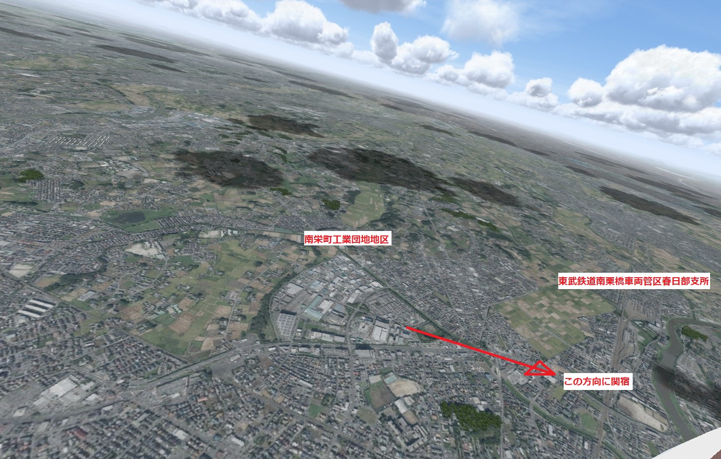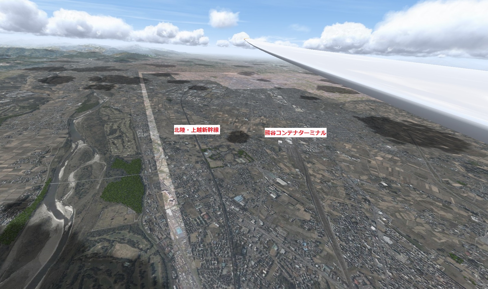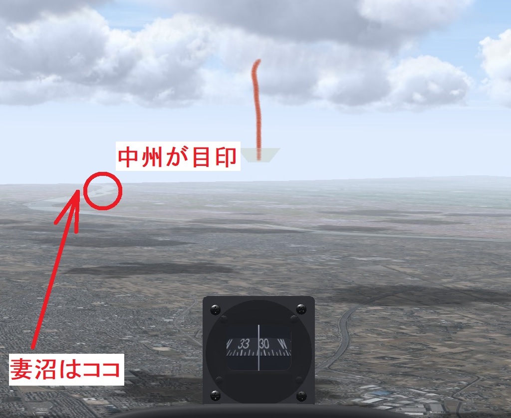 以下の画像はTP2の入間基地から7km程のところのタスクライン上の様子。高速道路と伊佐沼、特徴的な形をした川越グリーンパークの位置関係を捉えることができたら自機の位置が分かるのではないかと思います。