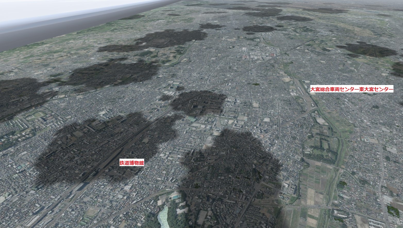 Japan-Eastでは河川、湖沼には水面テクスチャーをいれてあるので割と遠くからも形が分かるようになっています。また、高速道路はやっぱり大きくて分かりやすく、インターチェンジの形は特徴的なので上空からも見易くて位置を特定しやすいと思います。一方、鉄道や一般道は区別がつきにくくて難しいです。でも新幹線くらいは分かるかなぁというところ。大きな駅があるとこれが鉄道なんだと分かったりします。他には日本だと各地に大きなスタジアムがあったり、丘陵地帯になるとゴルフ場も目立ってきますね。